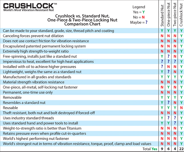 Crushlock Permanent Nut uses the characteristics of Extreme Vibration Resistance, Unsurpassed Strength and Extreme Performance as a Bolted Solution. Separately each characteristic has a distinct advantage, the combined characteristics creates a nut fastener that is "The New Standard For Mission Critical Applications". When permanent nut performance is required for extreme conditions and environments in extreme applications, Crushlock Permanent Nut is the only solution.