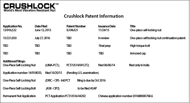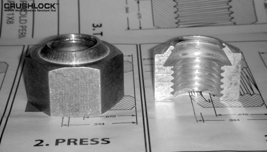 The Crushlock Permanent Nut was initially named the Arnold Permanent Nut, in honor of the inventor. The journey began in March 2011 when Crushlock Permanent Nut inventor, Mr. Arnold, was watching a short Japanese news brief about a fastener company in Japan. This company made what is advertised as the world's most vibration resistant two-piece locking nut. During an interview, the owner/inventor stated he has been trying to invent a one-piece nut that is not affected by vibration for thirty years, but was unable to do so. This one-piece nut had interest from the aerospace companies because it would save weight and not loosen.