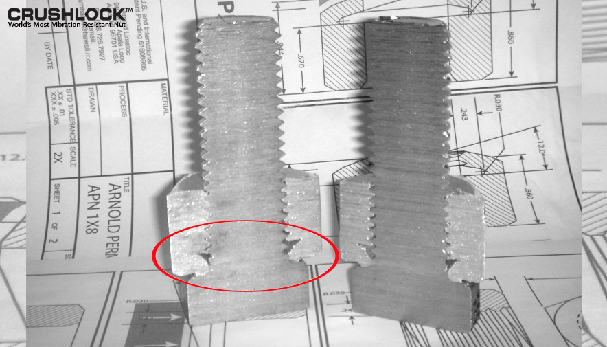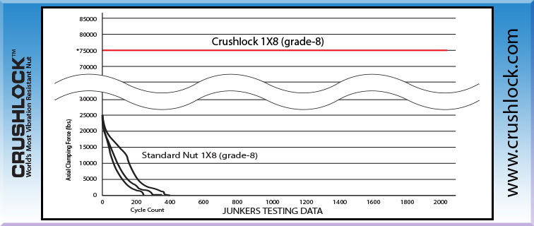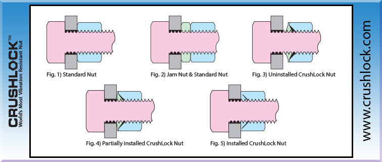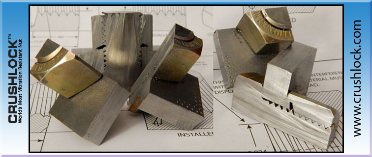 Crushlock Permanent Nut is the only nut fastener in the world that does not use "contact friction" for vibration resistance, instead it uses permanent internal pressure. The internal and external pressure of the Crushlock Permanent Nut are equal when installed. Because vibration cannot affect Crushlock Permanent Nuts internal pressure, vibration is no longer a factor and has no effect on a properly installed Crushlock Permanent Nut. Laboratory testing has shown that Crushlock Permanent Nut exceeds all vibration standards (Aerospace, Automotive, Construction, Railroad, etc.). Once installed, Crushlock Permanent Nut must be destroyed to be removed, it is physically impossible for Crushlock Permanent Nut to vibrate loose.