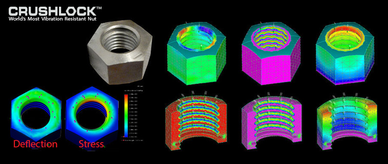 Crushlock Permanent Nut was engineered for extreme performance from its inception by using computer modeling in 2D, 3D and Finite Element Analysis(FEA). Crushlock Permanent Nut performance is permanent, once installed on a bolted joint, Crushlock Permanent Nut keeps the bolted pressure even if the nut is destroyed and profile cut-in-quarters. Crushlock Permanent Nut cannot release pressure even if cut-in-half with the bolt head cut-off, photos below. Laboratory tests show that when Crushlock Permanent Nut was over torqued during installation to past the point of nut failure, it would still retain its pressure and remain bolted. In other words, Crushlock Permanent Nut continues to function and hold pressure even after nut integrity failure. All other nut fasteners on the market today would violently release its pressure and fall-off once nut integrity fails.