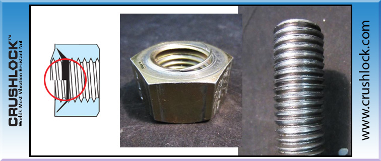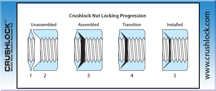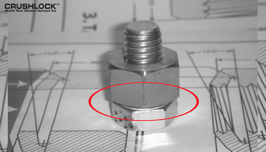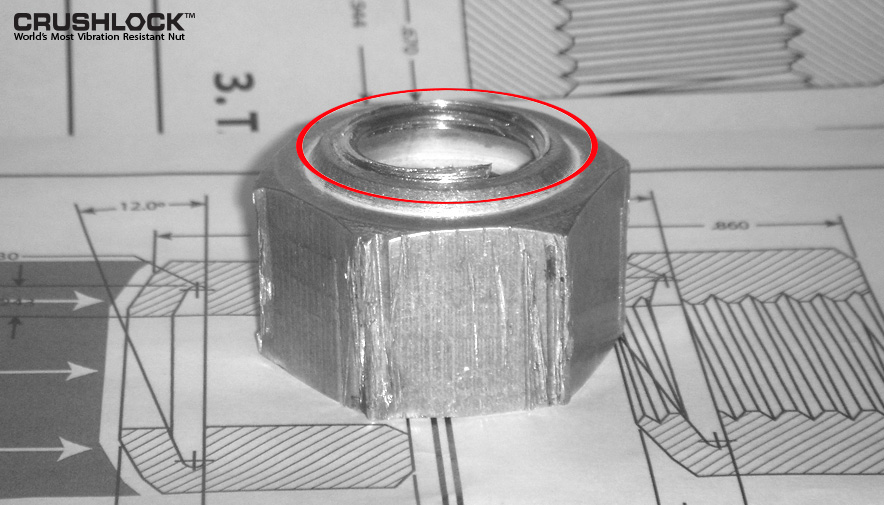 A: Crushlock Permanent Nut is the only nut fastener that does not use contact friction for vibration resistance. Instead of friction, Crushlock Permanent Nut uses permanent internal pressure. Since the internal pressure is permanent, vibration is no longer a factor. It is physically impossible for a properly installed Crushlock Permanent Nut to vibrate loose.