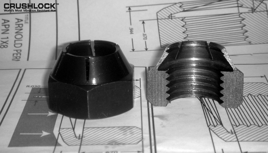 That night, Mr. Arnold thought about how a one-piece permanent nut could be designed. The only permanent nut that he could think of was two nuts torqued down and welded together. This works because the double nuts have "permanent internal pressure". Mr. Arnold decided that whatever the new nut design looked like, it would have to incorporate the same "permanent internal pressure" as the welded double nuts. Twenty minutes later he drew the first drawings of the Crushlock Permanent Nut. This new permanent nut incorporates and surpasses all of the advantages of one and two-piece locking nuts with none of the disadvantages. Until that point, the concept of a "permanent nut" was unheard of with many fastener professionals believing it was impossible.