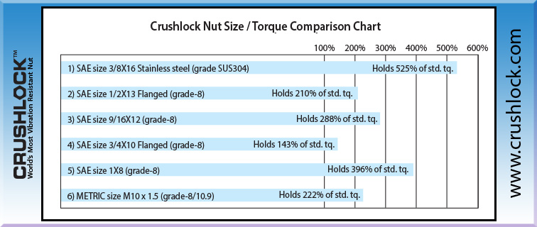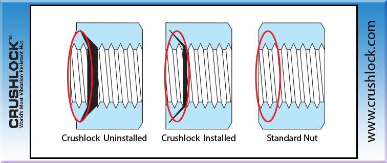 Crushlock Permanent Nut is the only nut fastener in the world that does not use "contact friction" for vibration resistance, instead it uses permanent internal pressure. The internal and external pressure of the Crushlock Permanent Nut are equal when installed. Because vibration cannot affect Crushlock Permanent Nuts internal pressure, vibration is no longer a factor and has no effect on a properly installed Crushlock Permanent Nut. Laboratory testing has shown that Crushlock Permanent Nut exceeds all vibration standards (Aerospace, Automotive, Construction, Railroad, etc.). Once installed, Crushlock Permanent Nut must be destroyed to be removed, it is physically impossible for Crushlock Permanent Nut to vibrate loose.